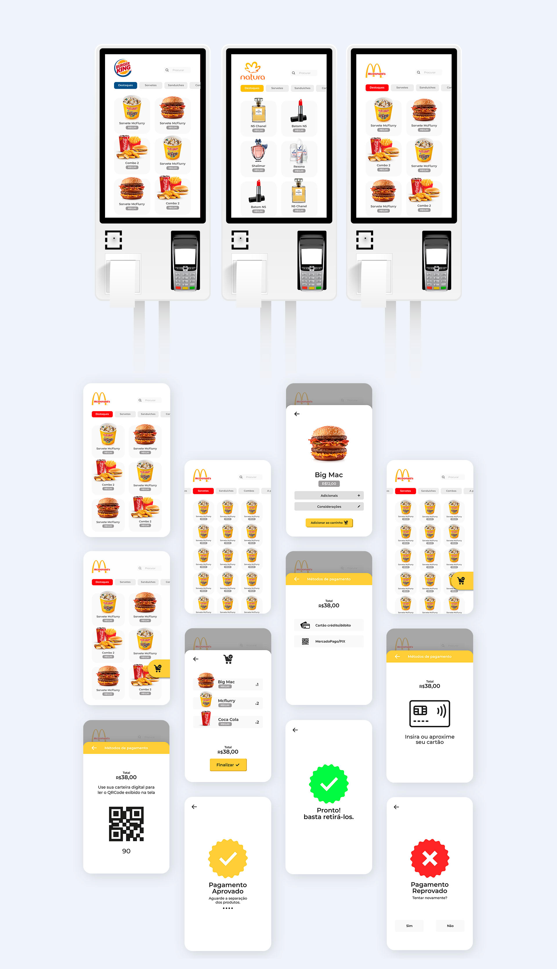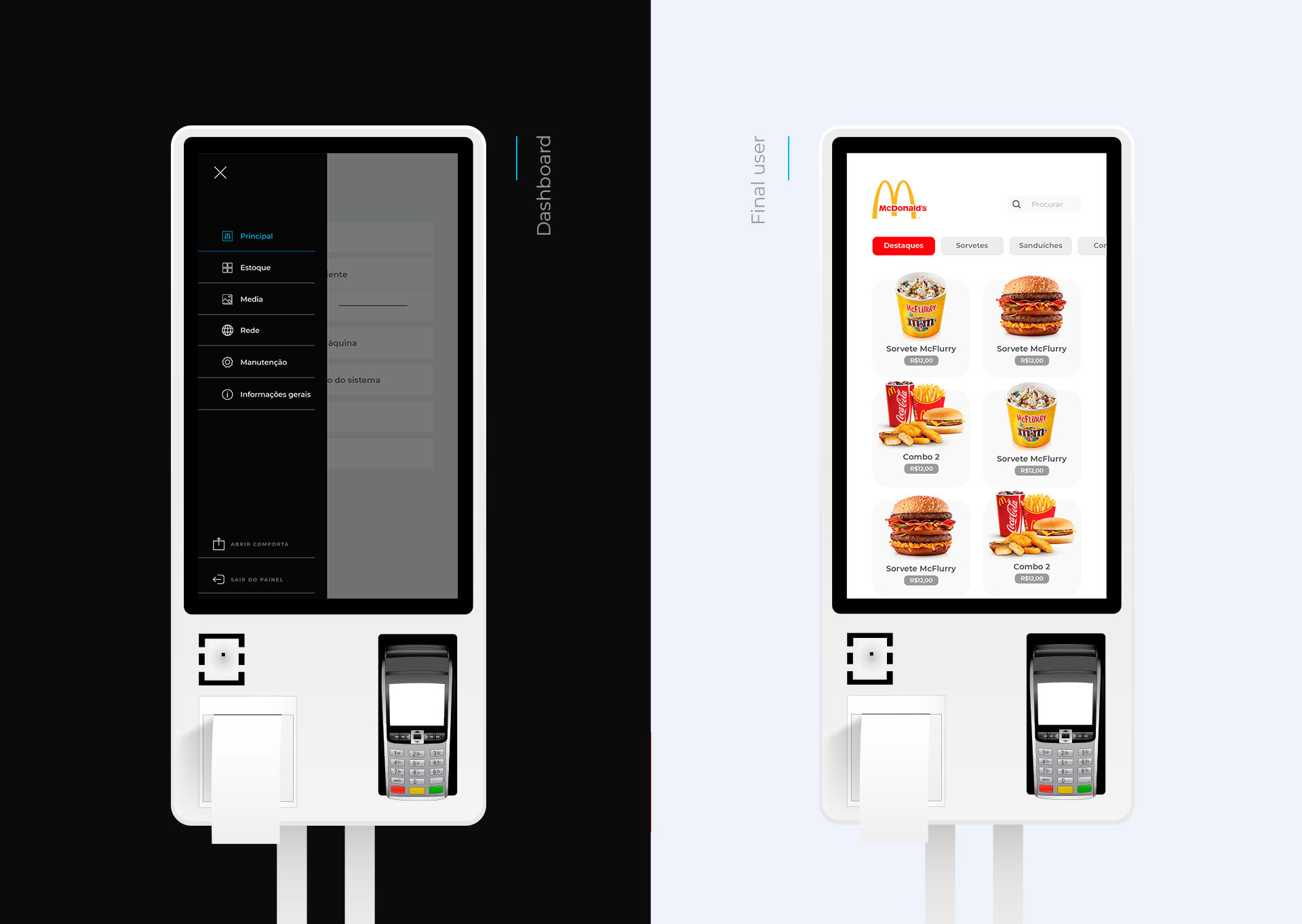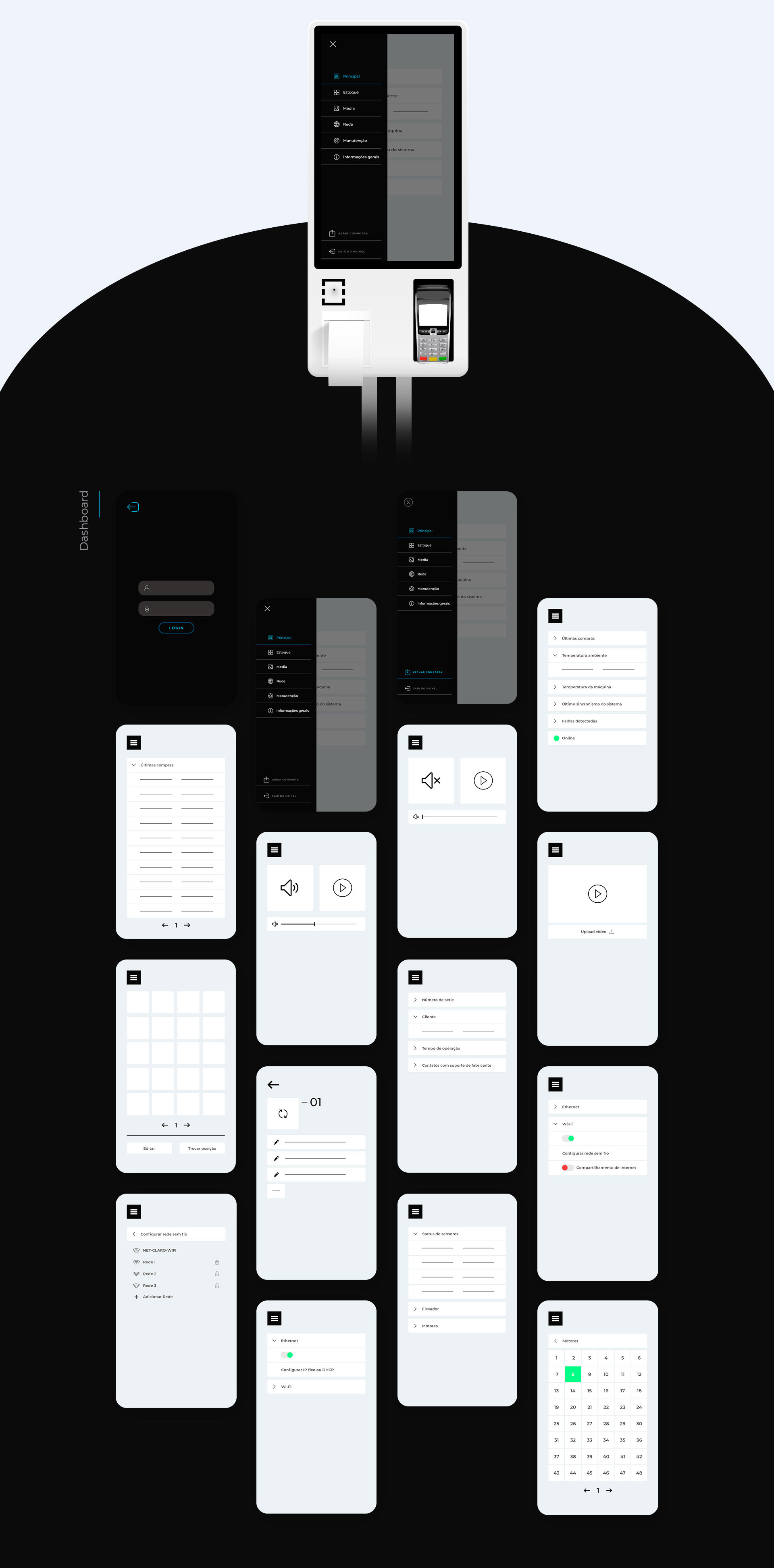 We developed the interface and user experience for kiosks and automation machines, along with its dashboard and administrative area. The layout was not made for any specific company, and should work for any company that contracts the services of Imach.